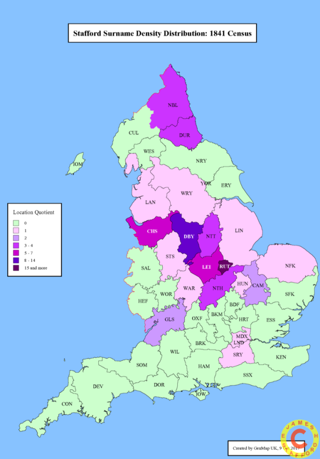 The results revealed a new locus for the Stafford surname in the county of Rutland, which had the highest density observed in both 1841 and 1851. The next highest density occurred in Derbyshire, followed by Cheshire and Leicestershire.